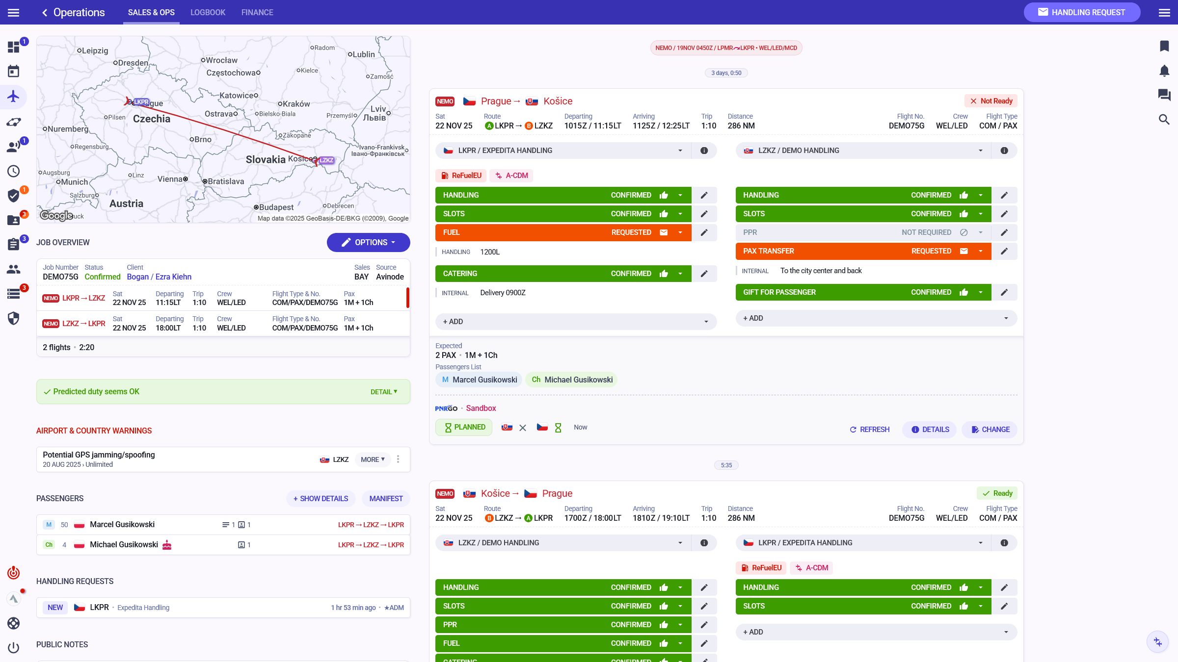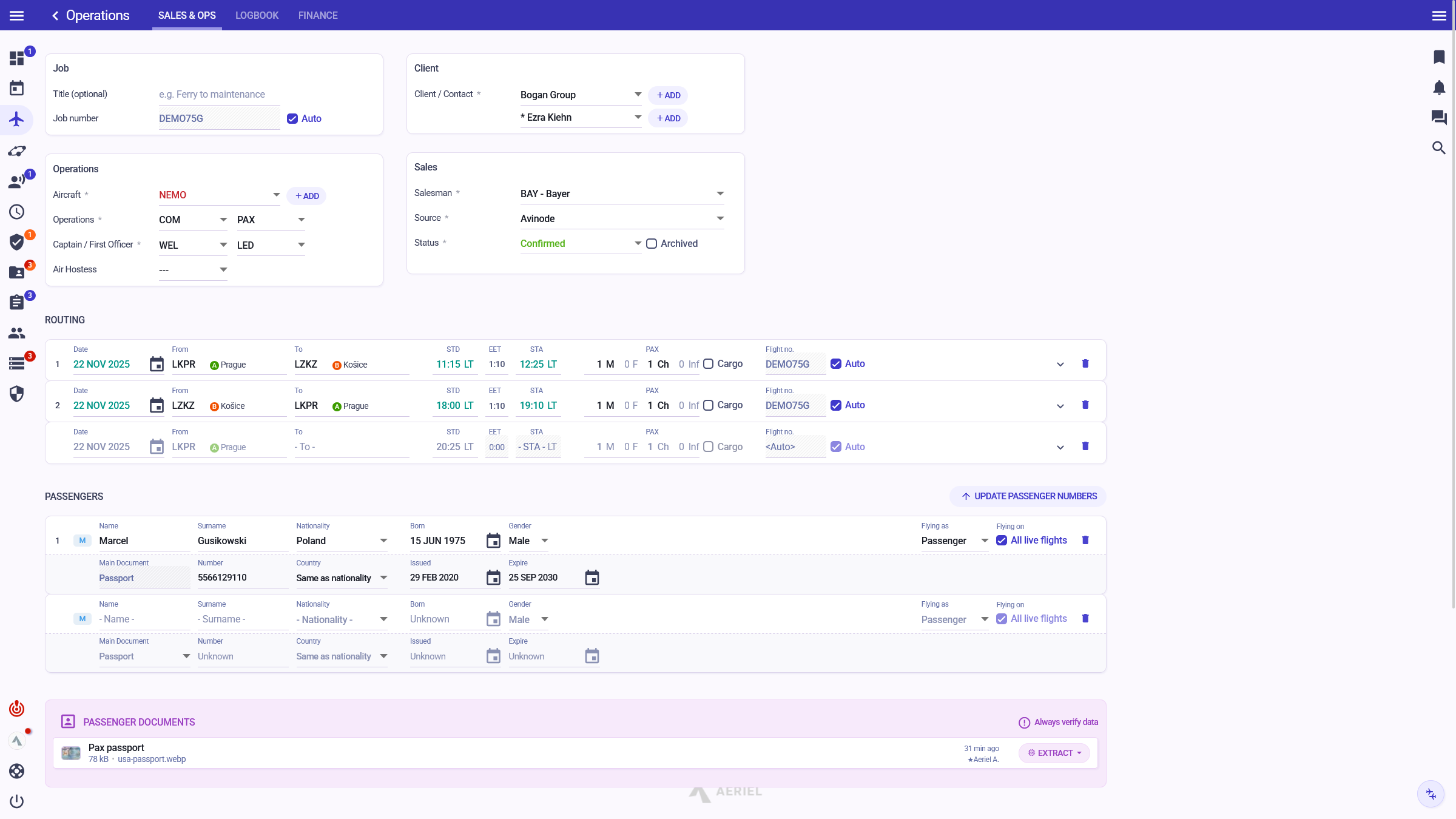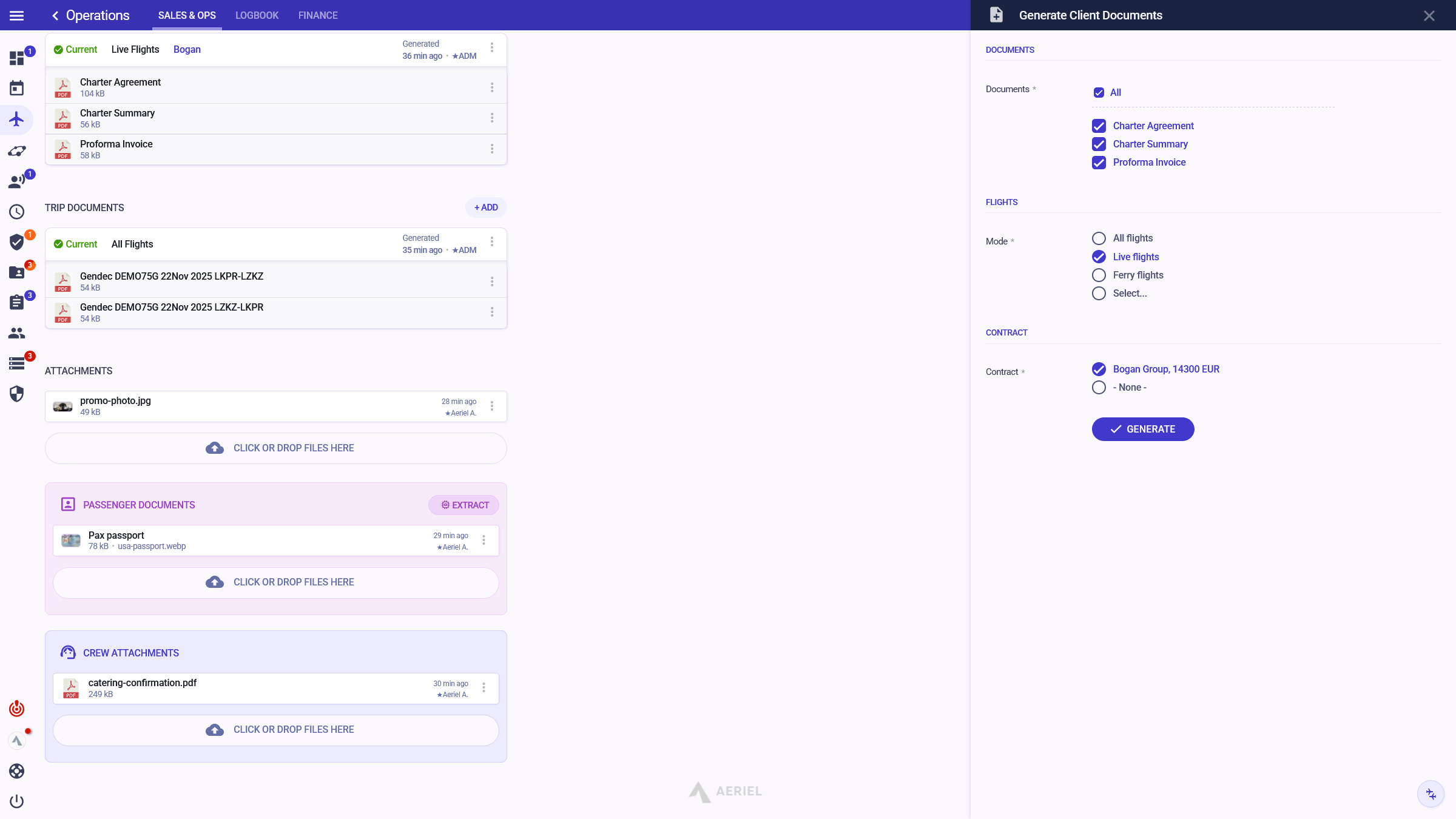Streamline your operations by quickly preparing flight itinerary with sales data, passenger manifests, generating charter documents, adding invoicing data, writing notes, and uploading documents.