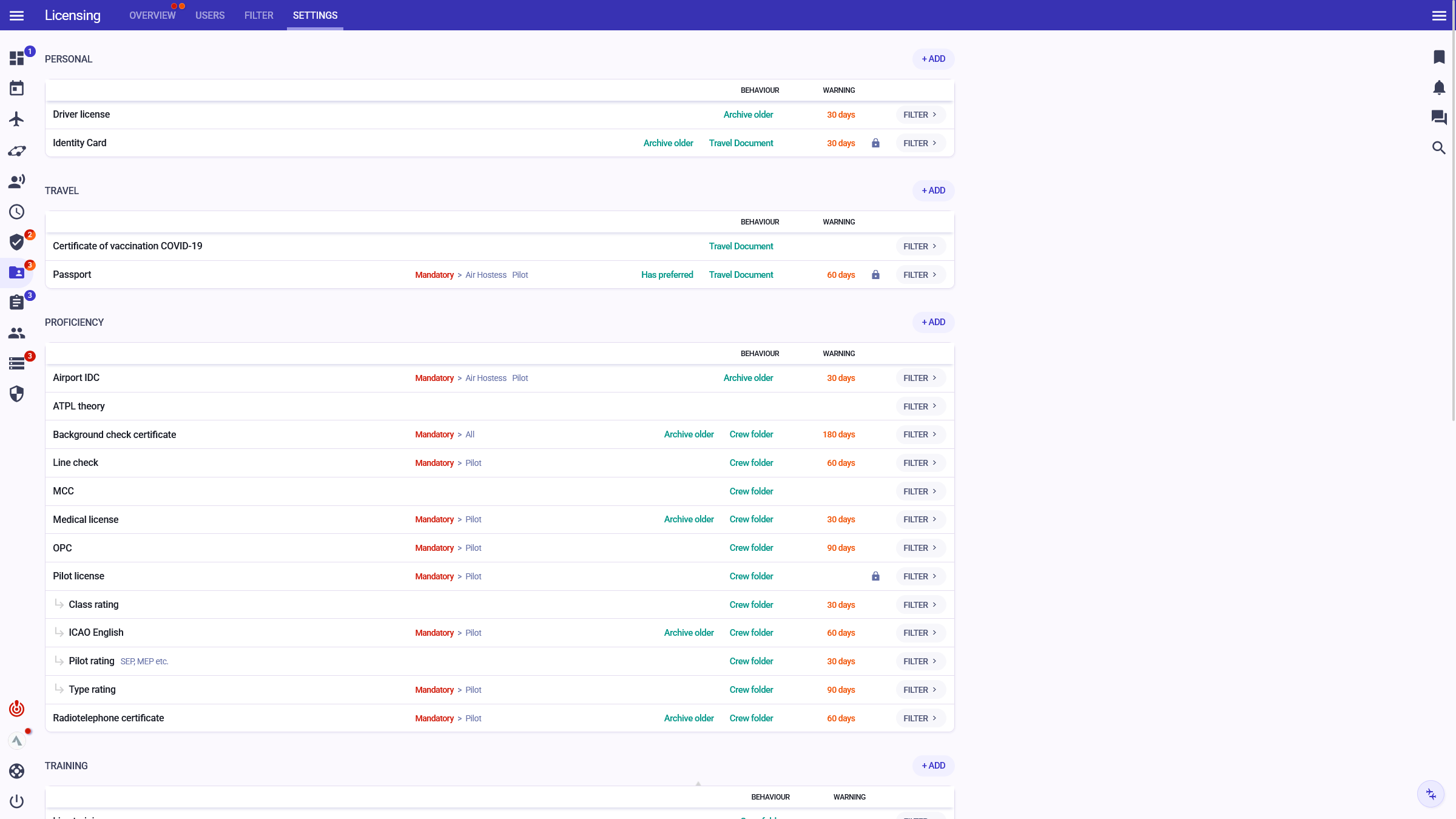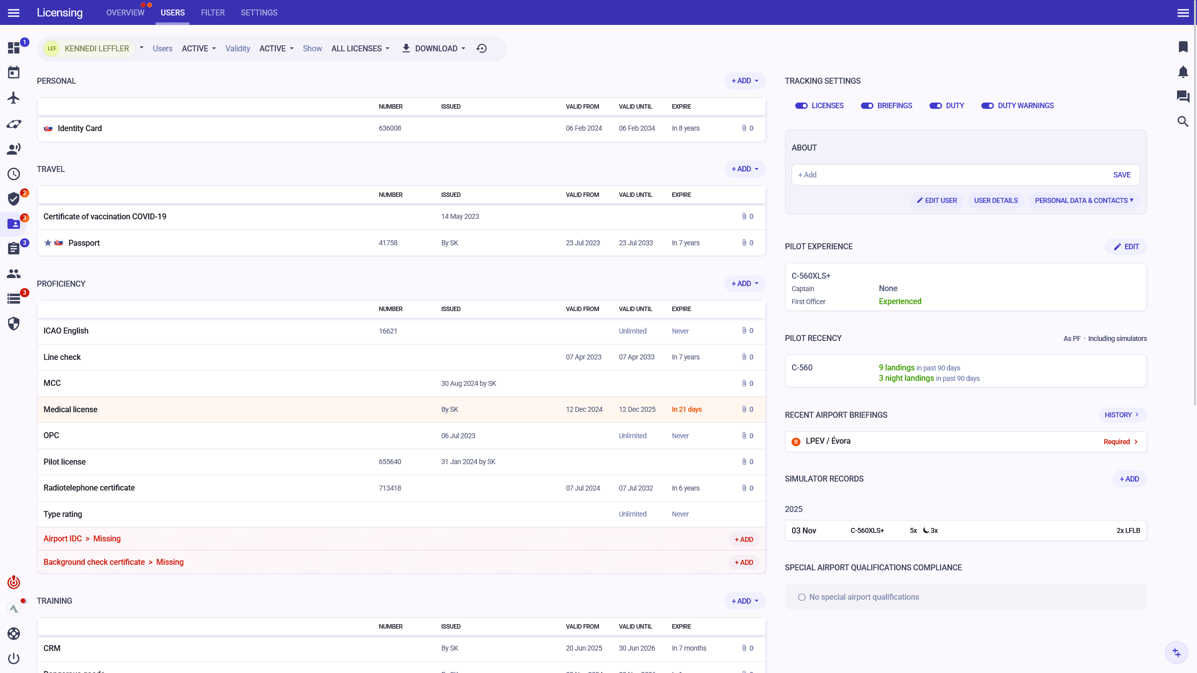 Manage personal documents and licences, proficiency and training records, pilot recency and experience, simulator records, and special airport qualifications.