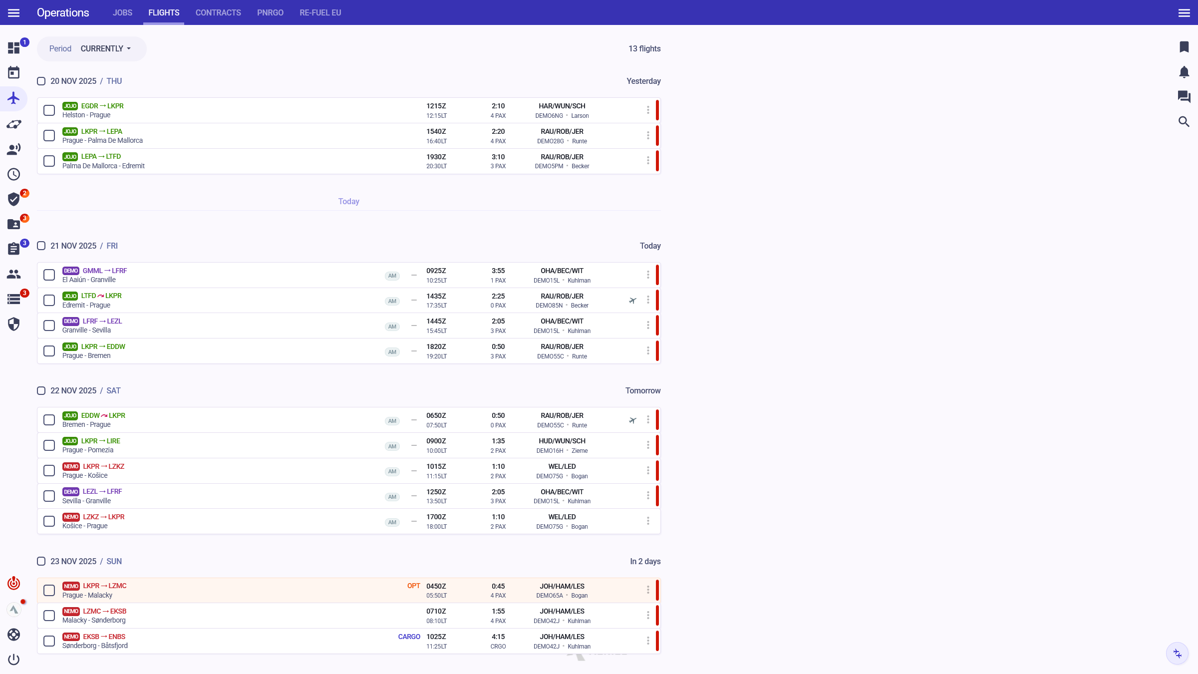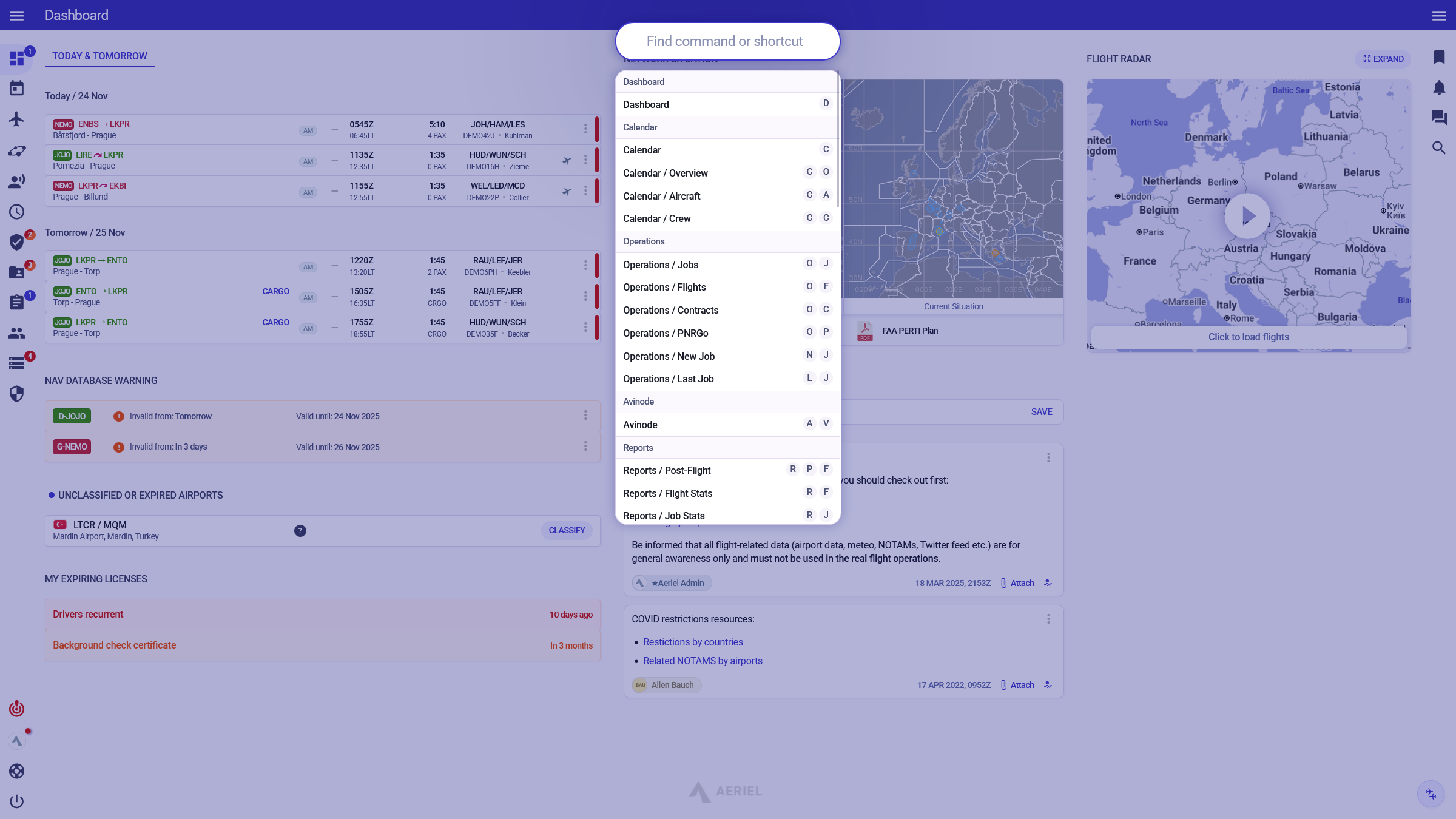 Everything you need, right where you need it. Current and upcoming flights and their status, expiring licences, unclassified airports, company bulletins, unread mandatory information, real-time updates from Eurocontrol and more.