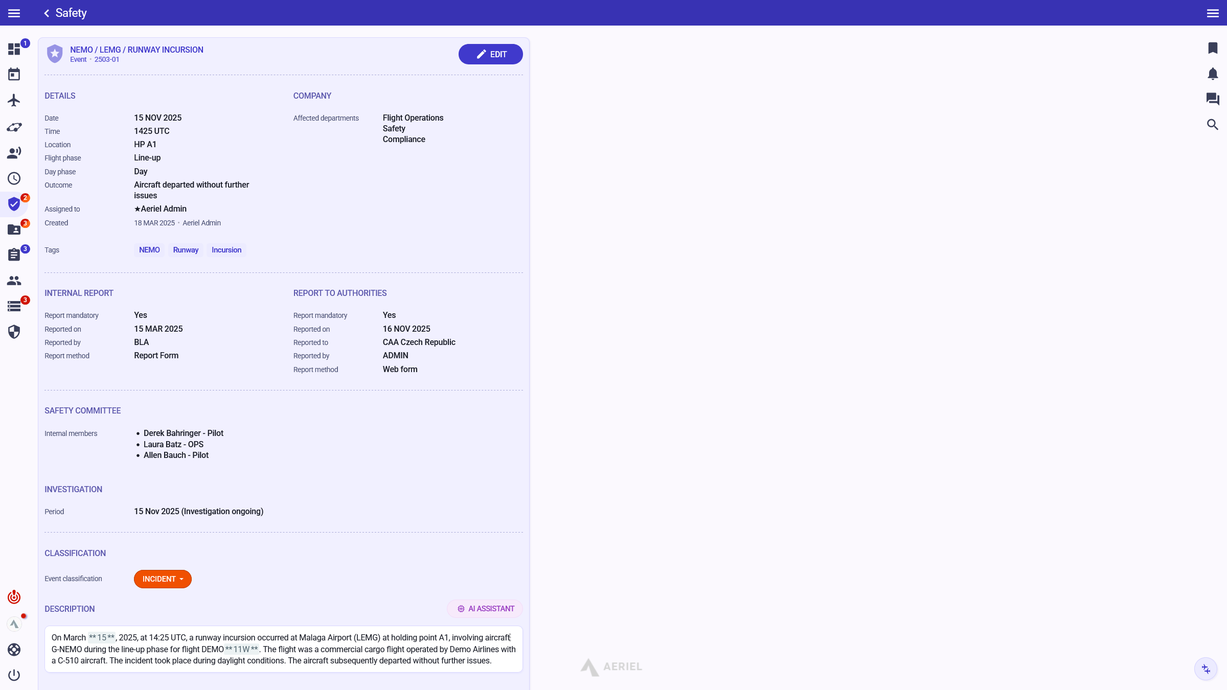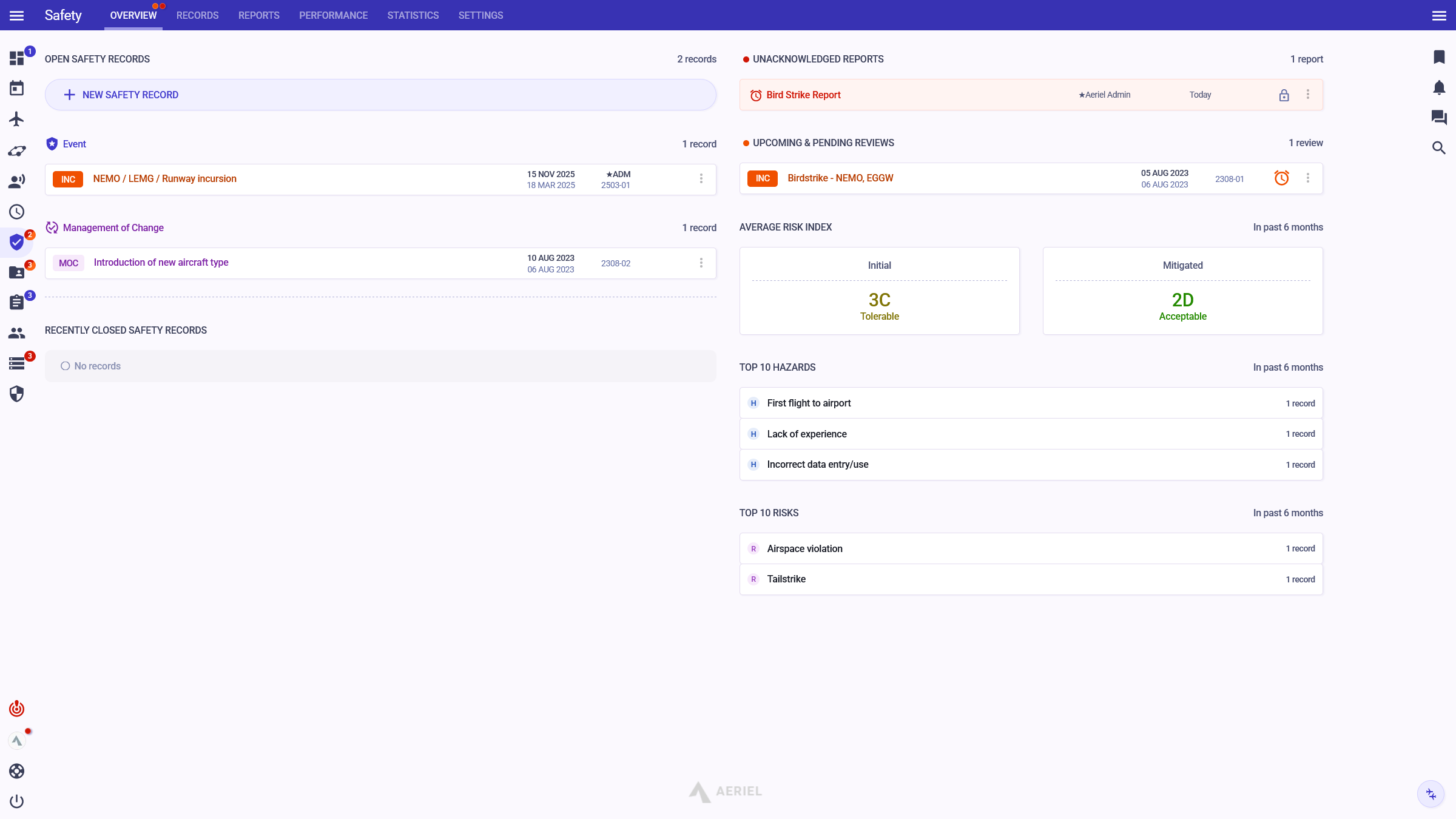 Investigations, final reports, mitigations, hazards & risks, safety performance indicators & targets (SPIs & SPTs), safety performance evaluation, safety statistics, emergency response guidance, and much more.