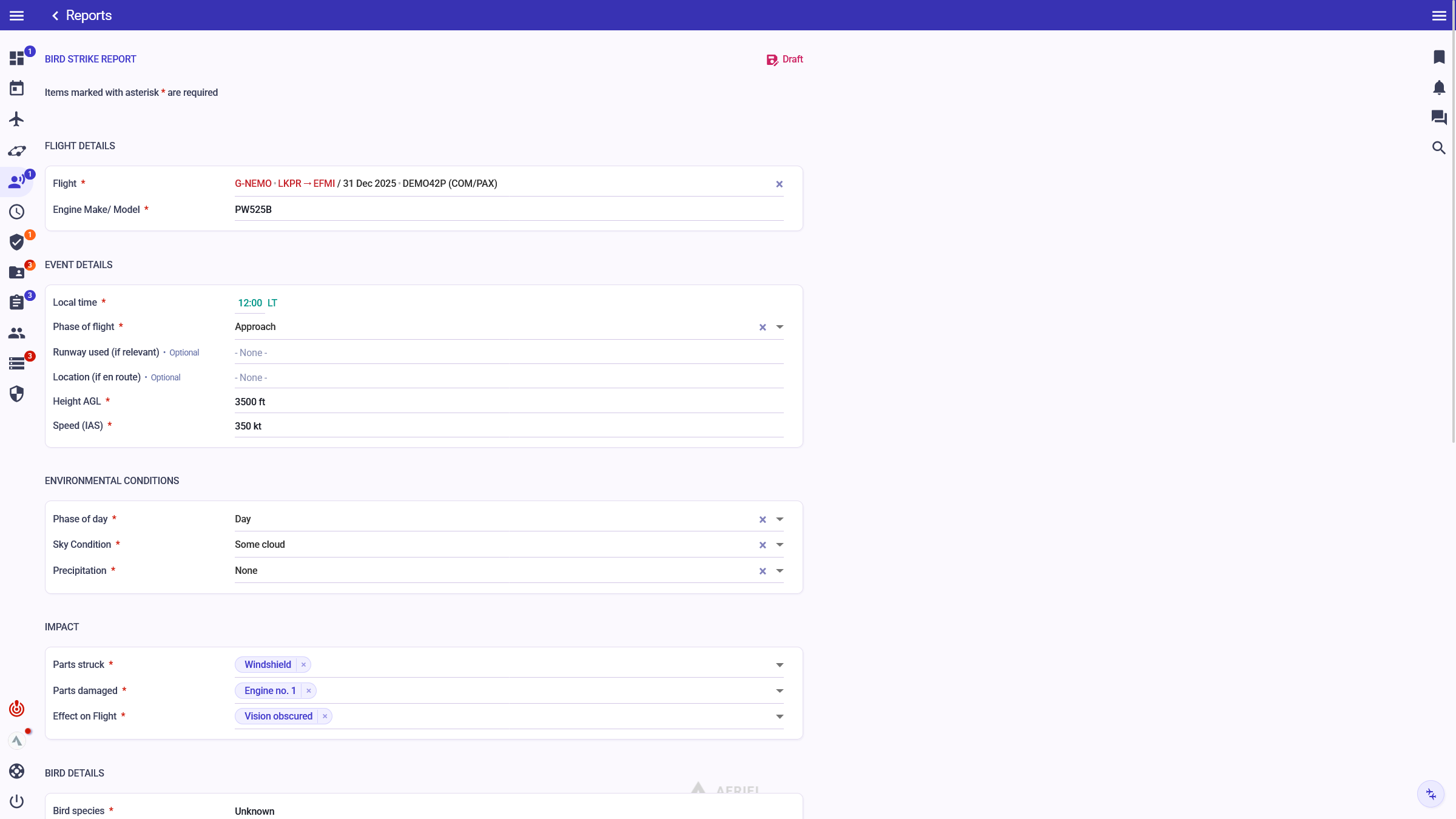 2) The Safety Reporting system allows you to freely design any report form for interactive filling. Mandatory, voluntary and confidential reports are supported. Flight reports, Bird strikes, TCAS RAs, Air traffic events, Maintenance events, Anonymous reporting — everything in one place.