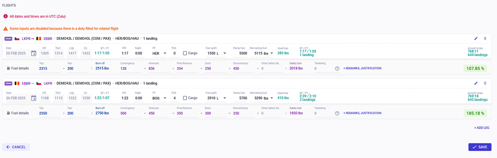 Log all mandatory fuel figures (Taxi, Contingency, Alternate, Final Reserve, Extra, Discretionary, Tankering), justify non-compliance, and export your data for mandatory reporting to authorities.